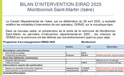 Le Conseil Départemental de l’Isère, par sa délibération du 28 avril 2023, a souhaité redéfinir les modalités d’intervention de son opérateur, l’EIRAD, sur le moustique-tigre. Dans ce nouveau cadre, et compte-tenu de la sortie de la commune de Montbonnot-Saint-Martin du périmètre d’intervention départemental en 2025 ; les missions de l’EIRAD sur la commune ont été définies par conventionnement.