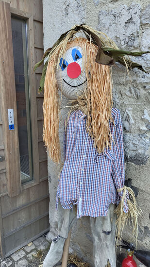 Épouvantail souriant à l'entrée du bâtiment principal de la Maison des Arts.