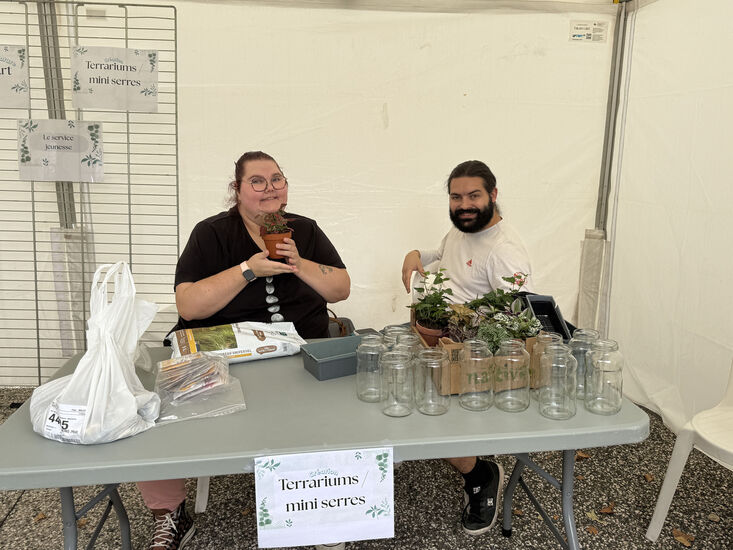 Stand du centre de loisirs avec Alexandra et Thomas, agents de la Mairie.