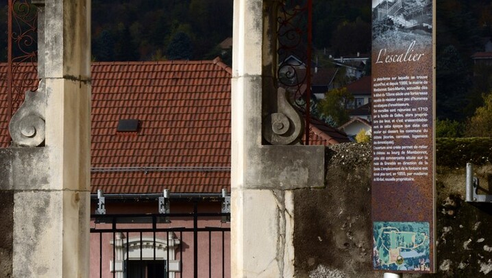 L’escalier qui relie la rue du Général de Gaule au parc Miribel est dans un style néo-classique. Il est probable que son aspect actuel date du XVIIIème siècle, vers 1710, au moment même où la propriétaire des lieux, Madame de Galles fait « rajeunir » les remparts. Il dessert alors les communs du château (écuries, grange, logement des domestiques). Cet accès permet ainsi de relier le château au bourg de Montbonnot, petite cité commerçante située sur la route de Grenoble en direction de la Savoie. L’emplacement de la fontaine est donné plus tard, en 1855, par Madame de Miribel, nouvelle propriétaire dans un style néo-classique