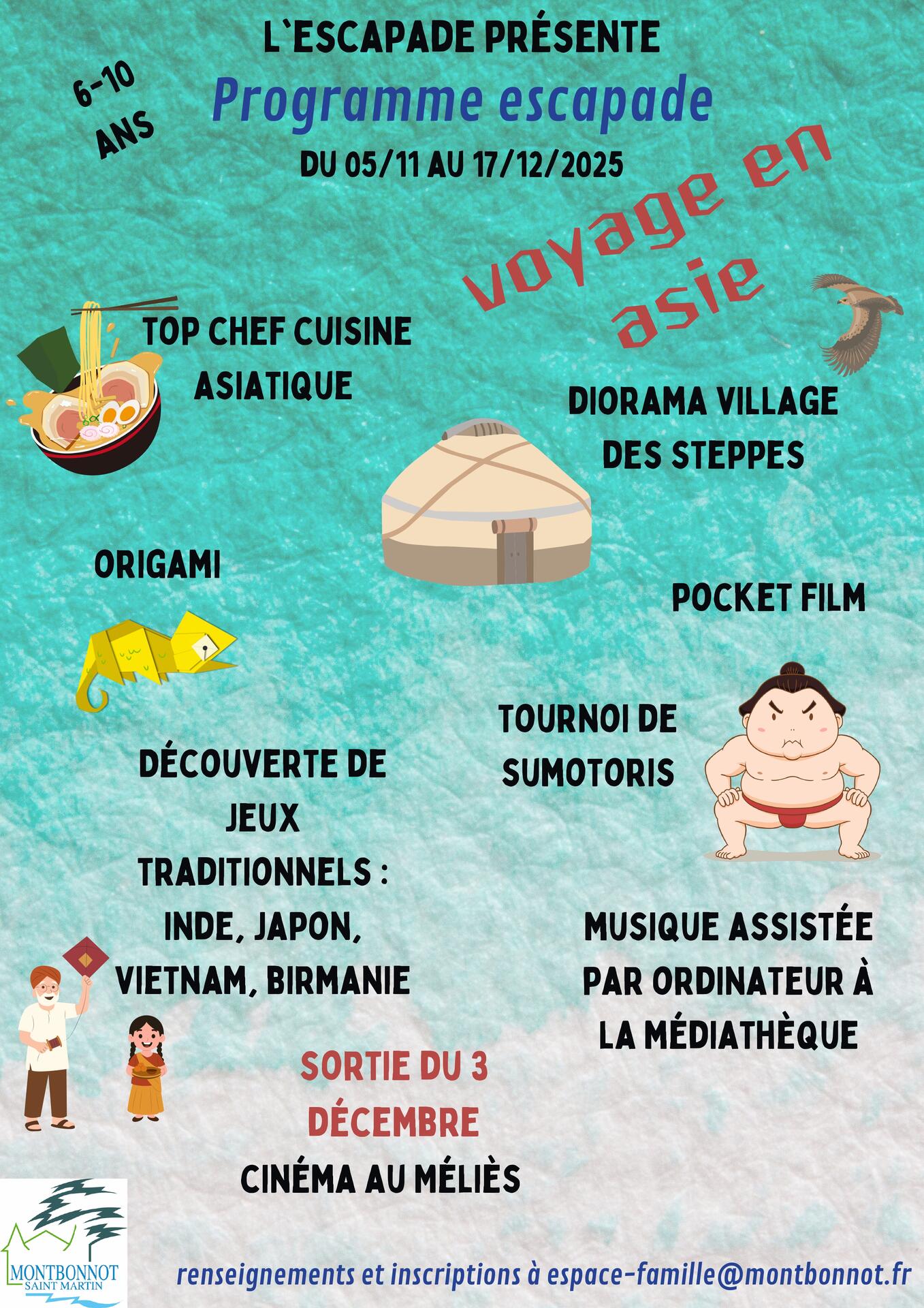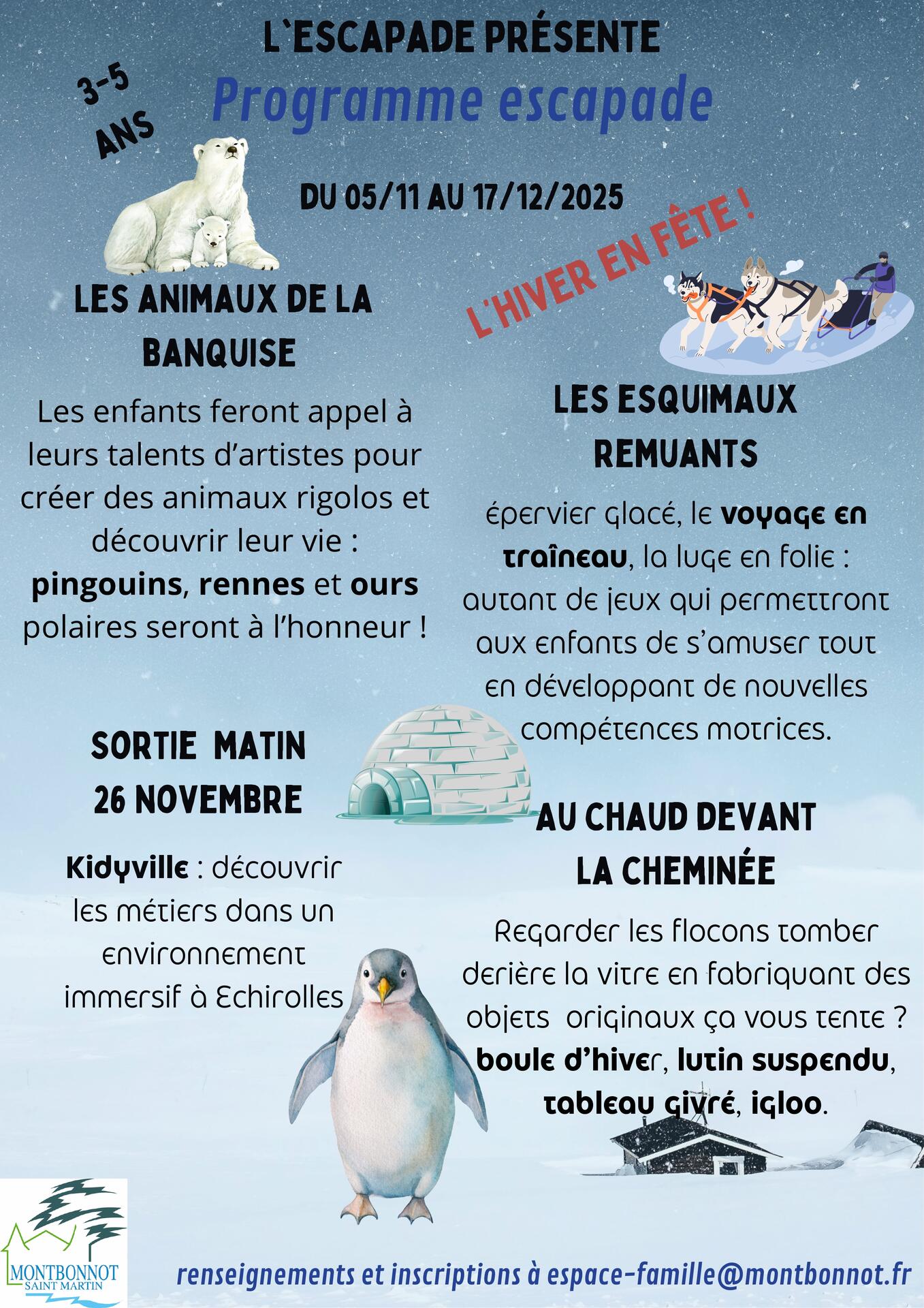 ESCAPADE des mercredis : Le bulletin d'inscription 2025/2026 est disponible sur l'espace personnel de l'Espace Citoyens (dès lors que "l'Ouverture de dossier" a été effectuée).